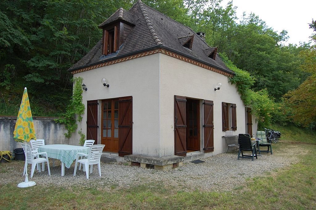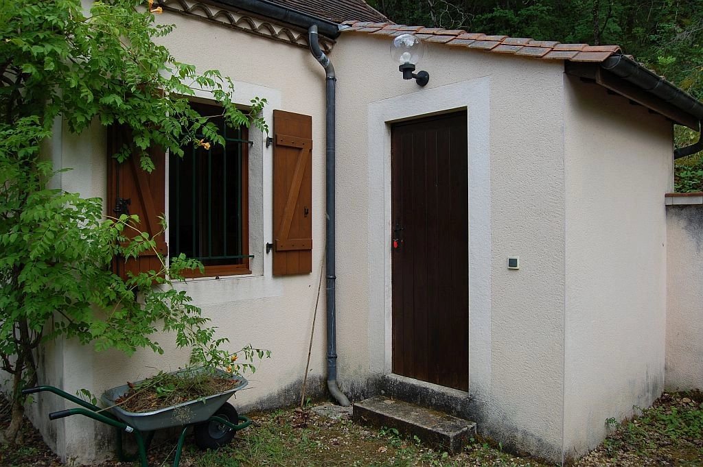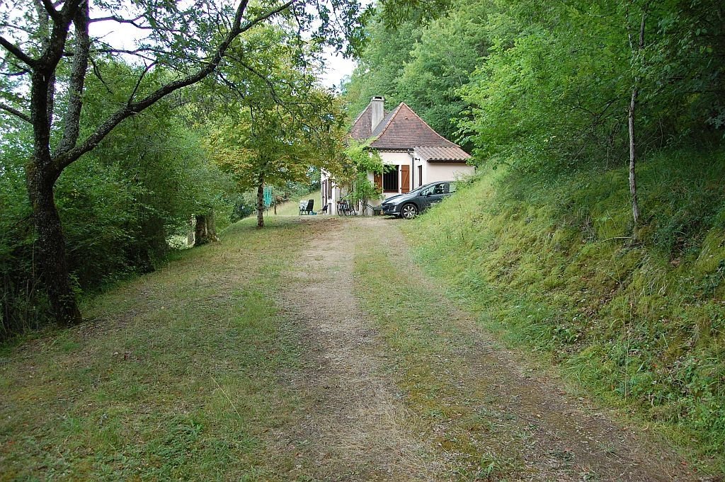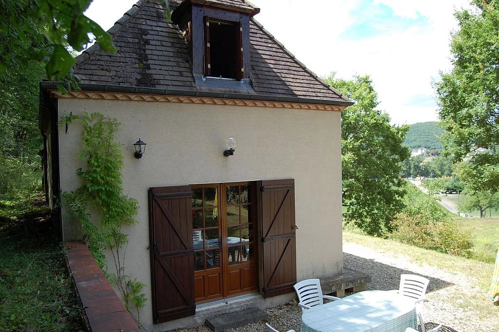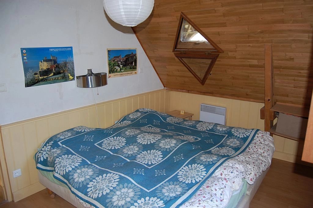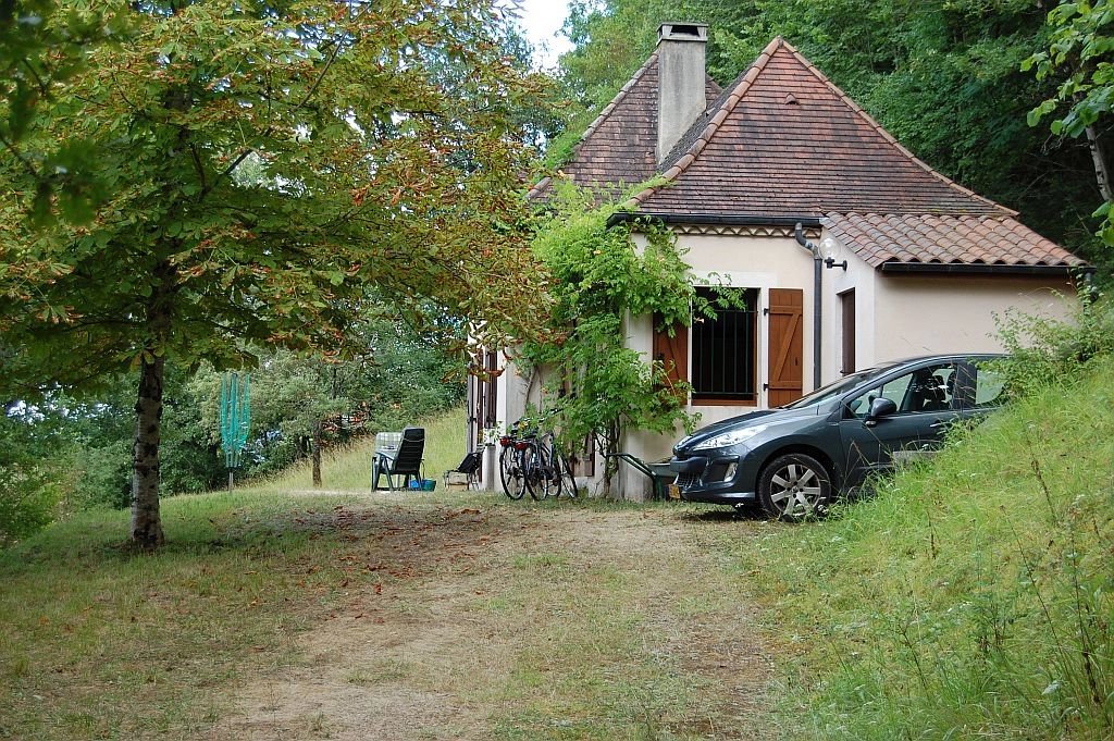 Tegenover het indrukwekkende Middeleeuwse kasteel van Beynac staat deze leuke vakantiewoning uit 1996 en uitgebreid in 2002 op 1,5 ha vooral beboste grond. Vanaf het terras bij de woning is er een uniek, panoramisch uitzicht op het kasteel en de vallei van de Dordogne. De woning heeft op de begane grond een ruime woonkamer met eenvoudige keuken, houtkachel, parketvloer en twee stel openslaande deuren naar de tuin, een slaapkamer met parketvloer, openslaande deuren naar tuin en eigen betegelde badkamer met douche, toilet en wastafel. Op de etage - onder een schuin dak - zijn er een overloop, een ruime badkamer met douche, toilet en twee wastafels, en een ruime slaapkamer met hoge nok, zichtbare balken en dakkapel. Tegen de woning bevindt zich een schuurtje voor opslag van (tuin)gereedschap, fietsen etc. Op het terrein is voldoende ruimte voor parkeren van voertuigen. Goed onderhouden woning met eenvoudig landelijk karakter. Een echte vakantiewoing. Ref. 659-AQ0233HA.